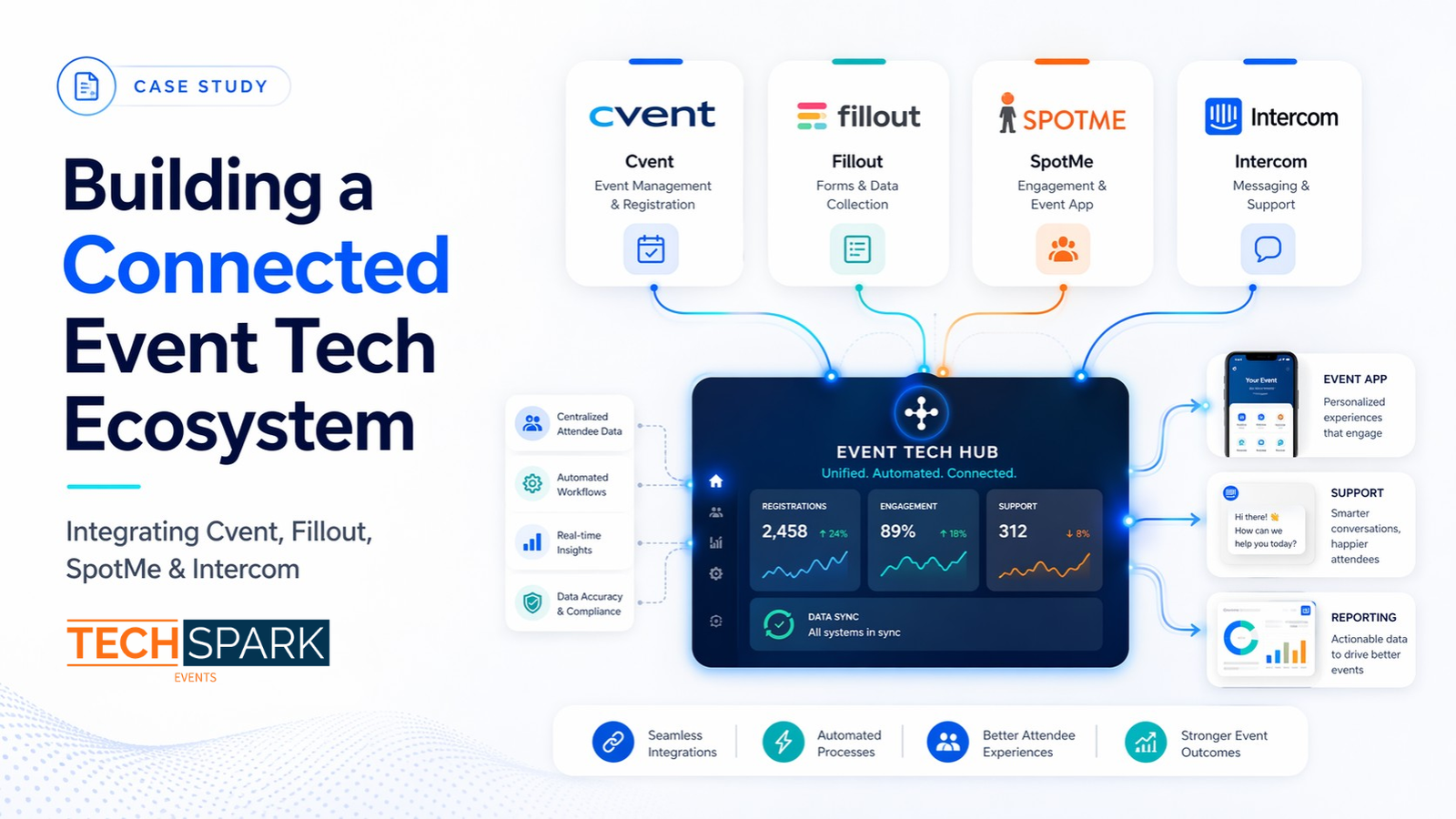 Tech Spark Events designed and implemented a practical integration framework across Cvent, Fillout, SpotMe, and Intercom so event data could move more smoothly between systems, manual effort could be reduced, and both internal teams and attendees could have a better experience.